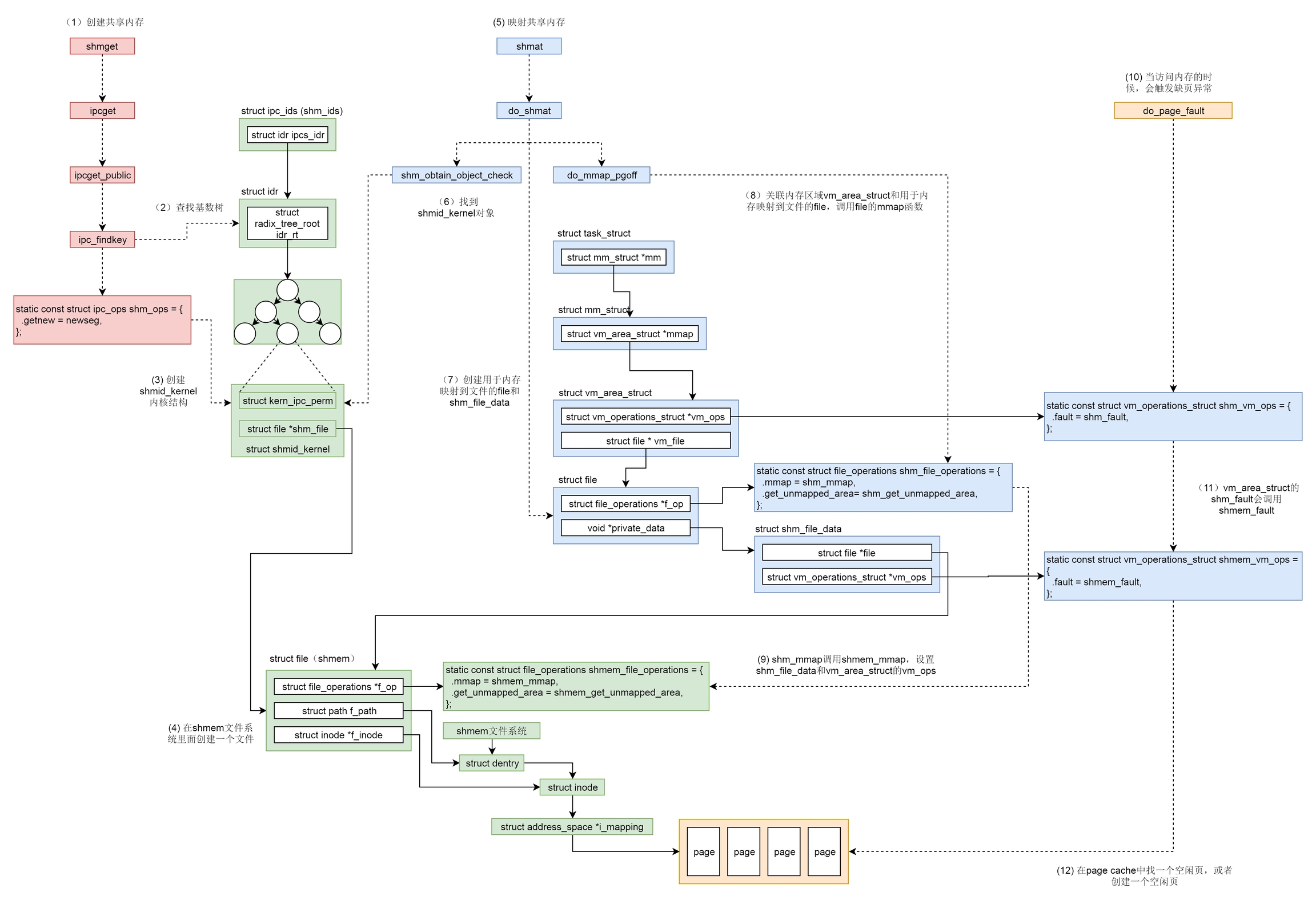 共享内存和信号量是有着相似性有可以共同使用从而完成进程通信的手段。下面引用极客时间中的两幅图来总结二者的整个过程。