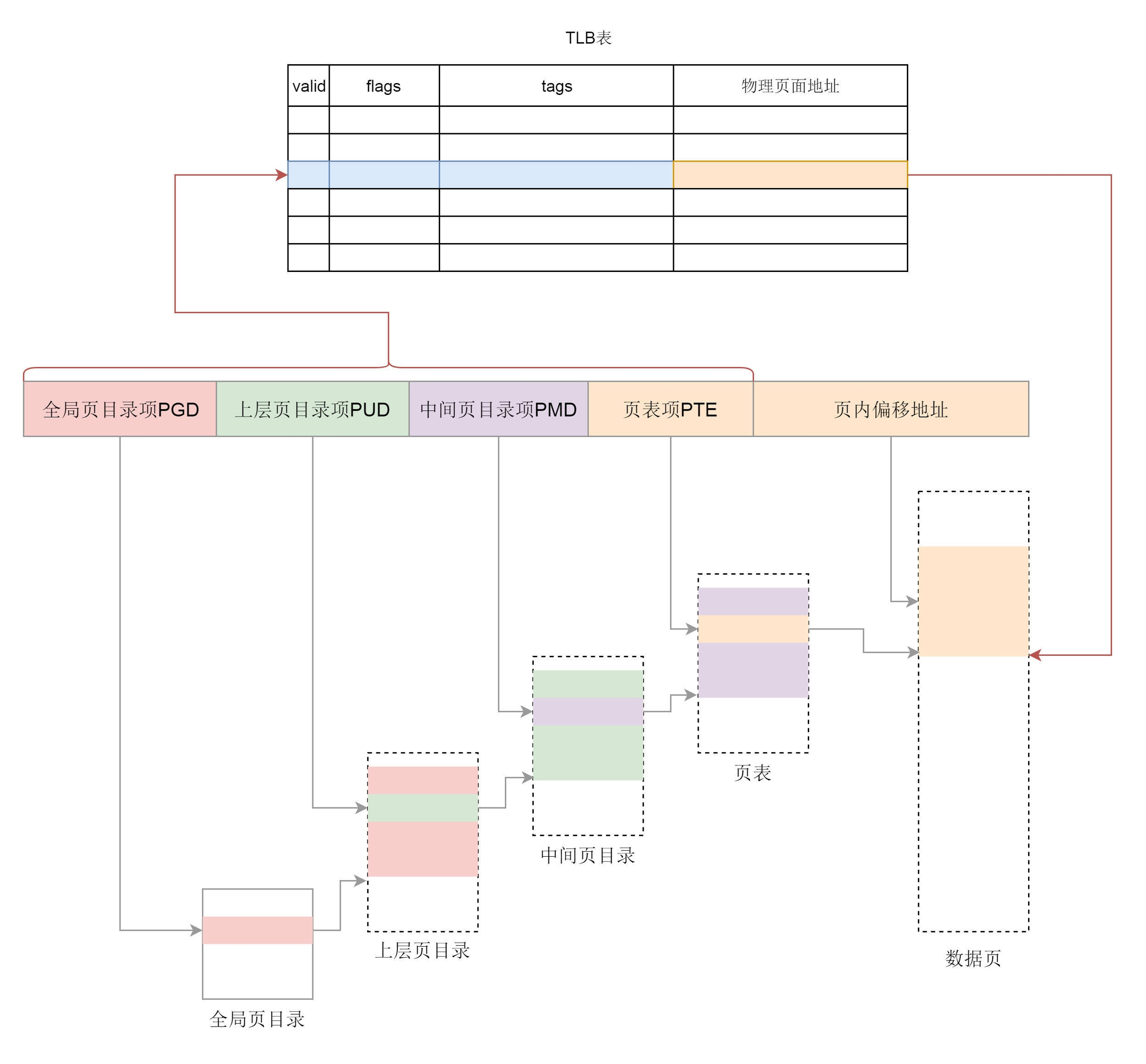 }通过以上步骤,用户态的缺页异常就处理完毕了。物理内存中有了页面,页表也建立好了映射。接下来,用户程序在虚拟内存空间里面可以通过虚拟地址顺利经过页表映射的访问物理页面上的数据了。页表一般都很大,只能存放在内存中。操作系统每次访问内存都要折腾两步,先通过查询页表得到物理地址,然后访问该物理地址读取指令、数据。为了加快映射速度,我们引入了 TLB(Translation Lookaside Buffer),我们经常称为快表,专门用来做地址映射的硬件设备。它不在内存中,可存储的数据比较少,但是比内存要快。所以我们可以想象,TLB 就是页表的 Cache,其中存储了当前最可能被访问到的页表项,其内容是部分页表项的一个副本。有了 TLB 之后,我们先查块表,块表中有映射关系,然后直接转换为物理地址。如果在 TLB 查不到映射关系时,才会到内存中查询页表。